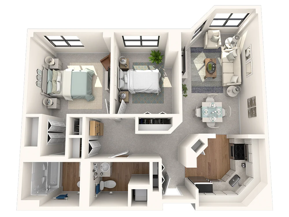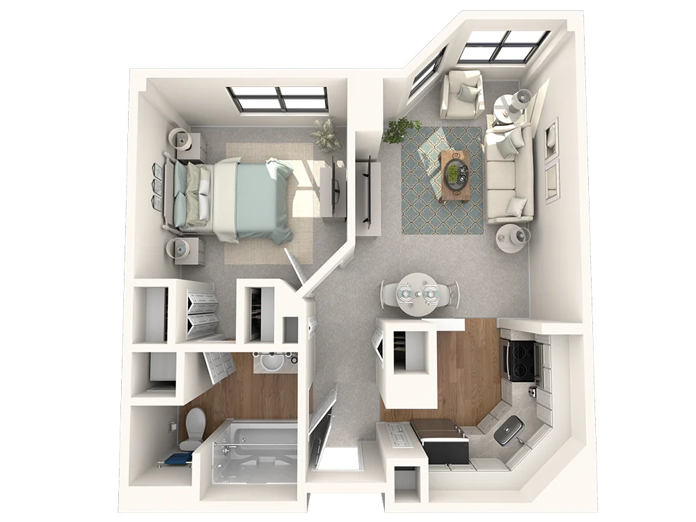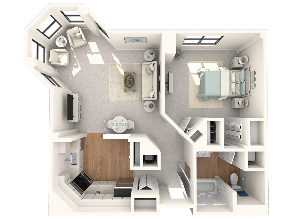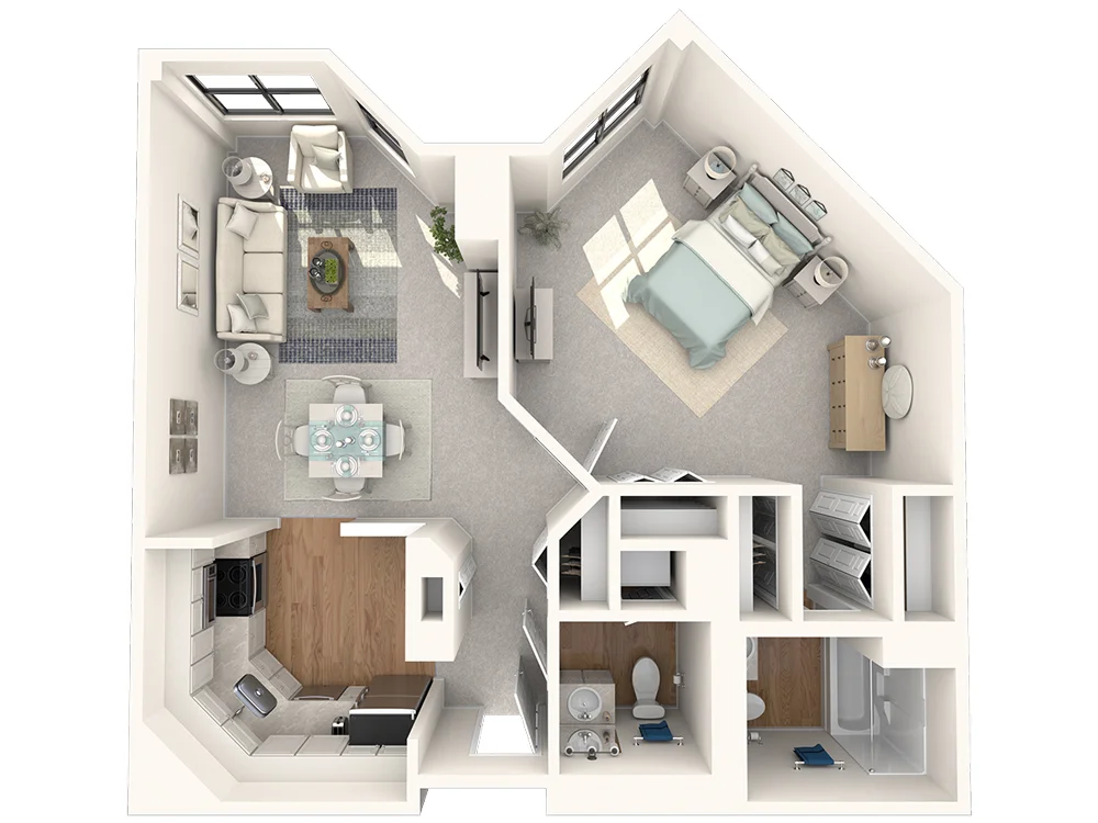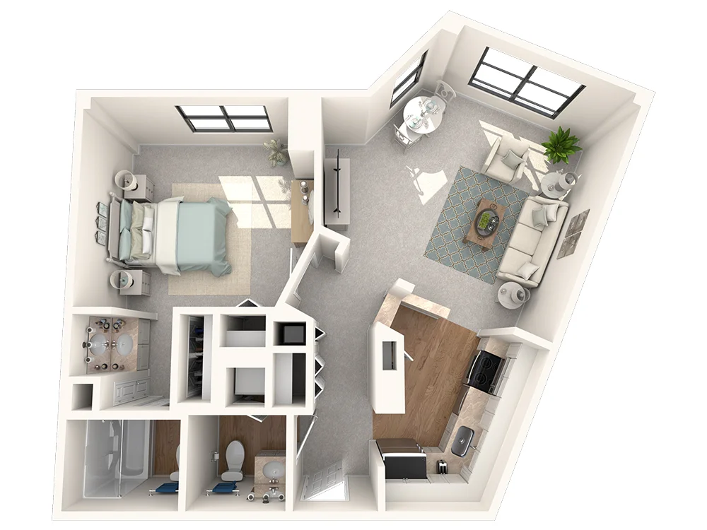 The Jefferson's nearly 900 square feet feels quite spacious with a sprawling bedroom and impressive walk-in closet. A bright bay window draws you into the living room, while the U-shaped kitchen offers both form and function. Two full baths complete this layout designed for those who enjoy a little extra elbow room.