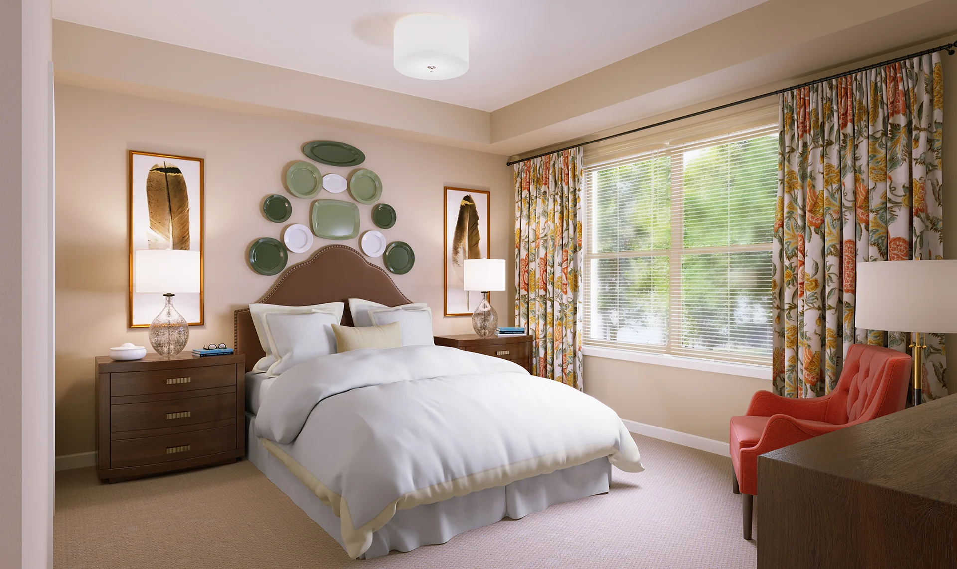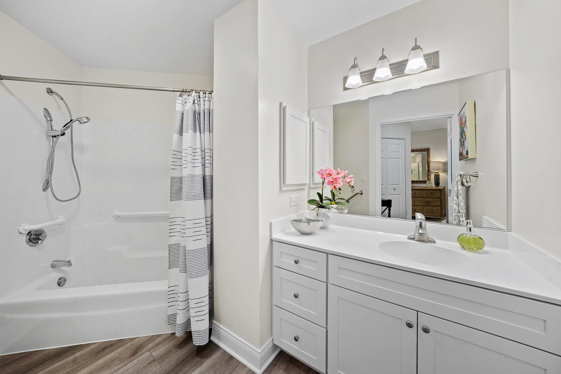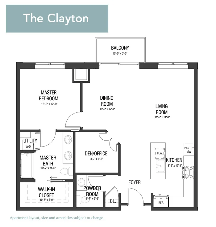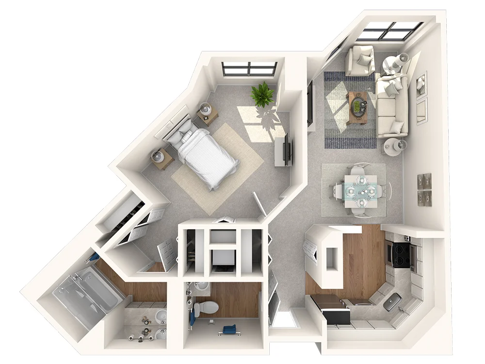 The Jefferson's nearly 900 square feet feels quite spacious with a sprawling bedroom and impressive walk-in closet. A bright bay window draws you into the living room, while the U-shaped kitchen offers both form and function. Two full baths complete this layout designed for those who enjoy a little extra elbow room.