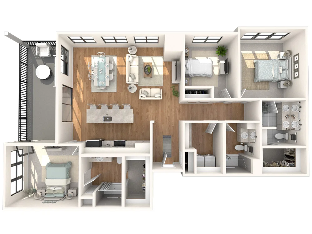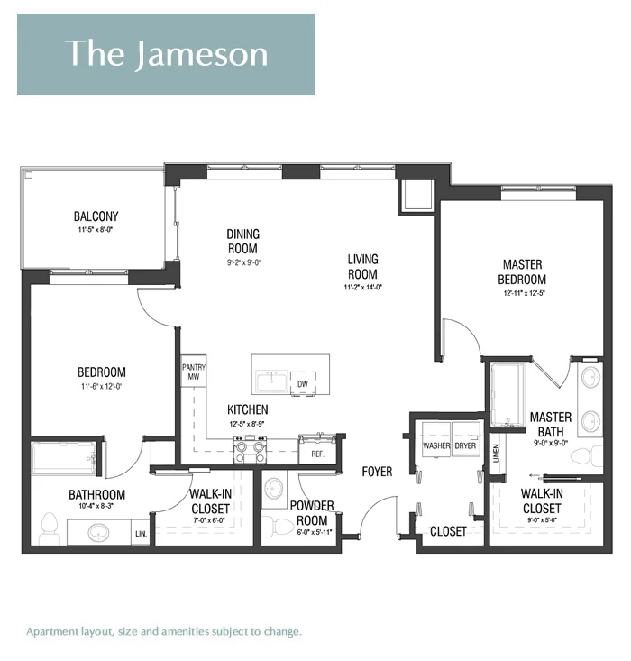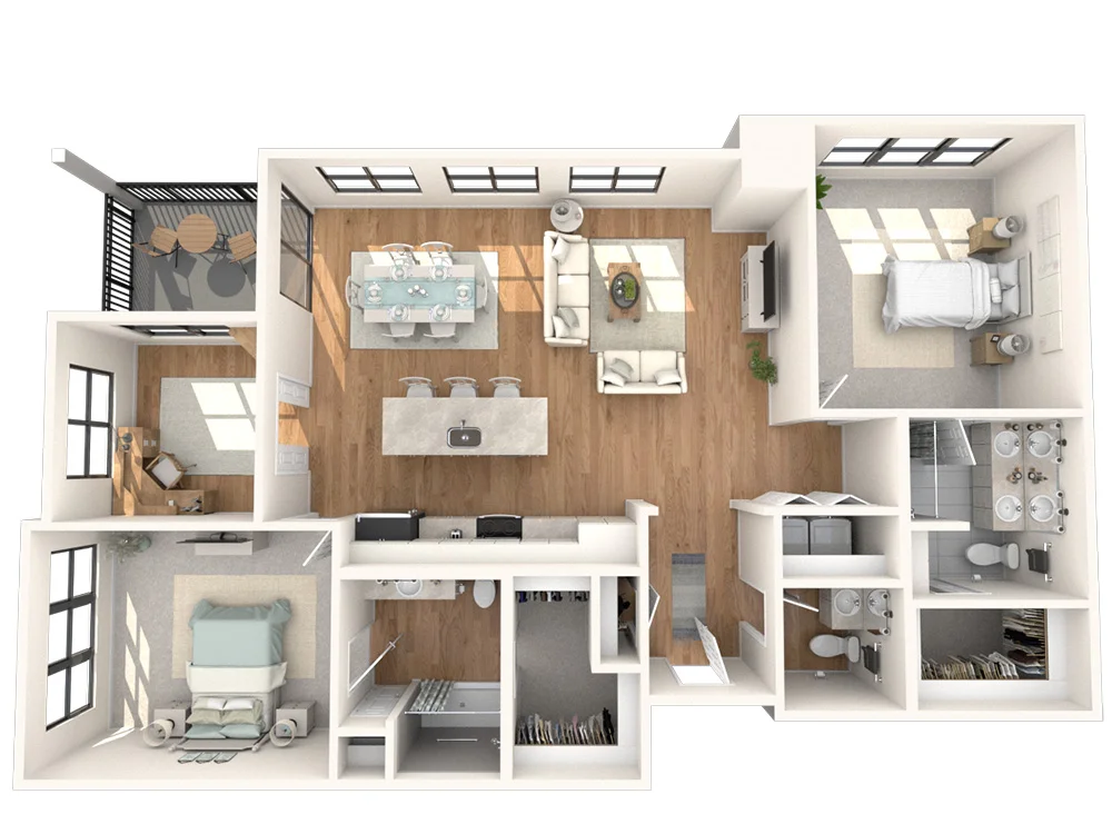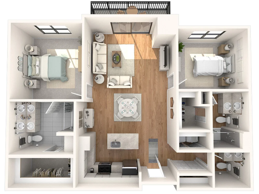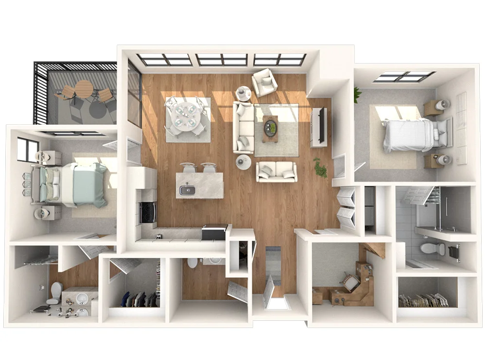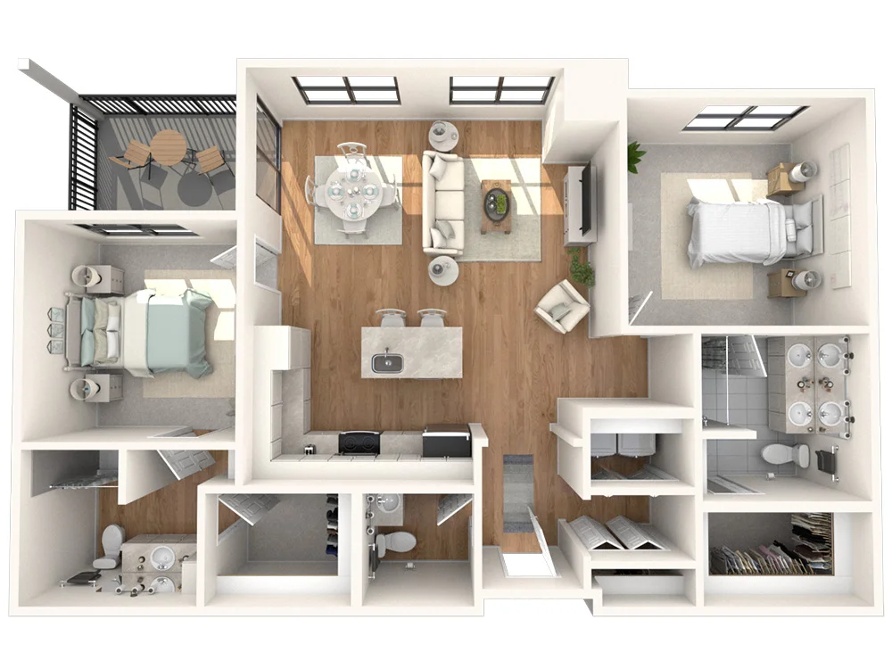 The Jameson offers a refined living experience with 1,288 square feet of space. Two bedrooms, each with an en-suite bathroom, plus an additional half bath, provide both comfort and convenience. Additionally, a cozy corner patio off the dining area extends your living space outdoors, while the open floor plan kitchen adds convenience.