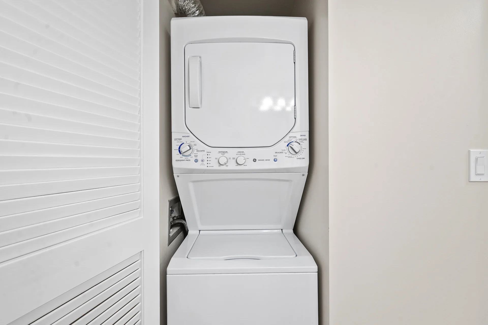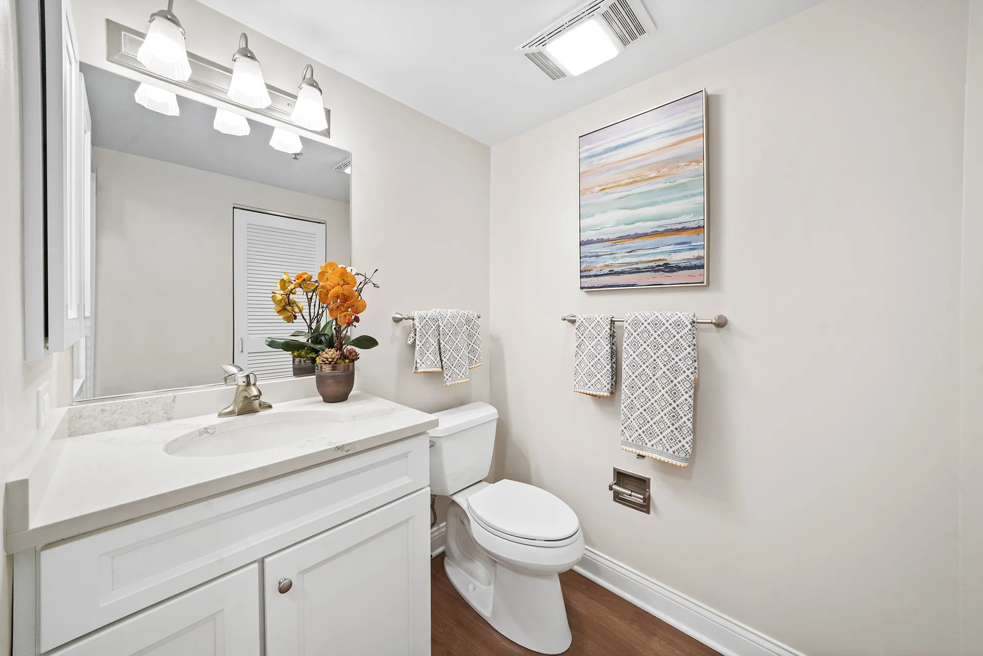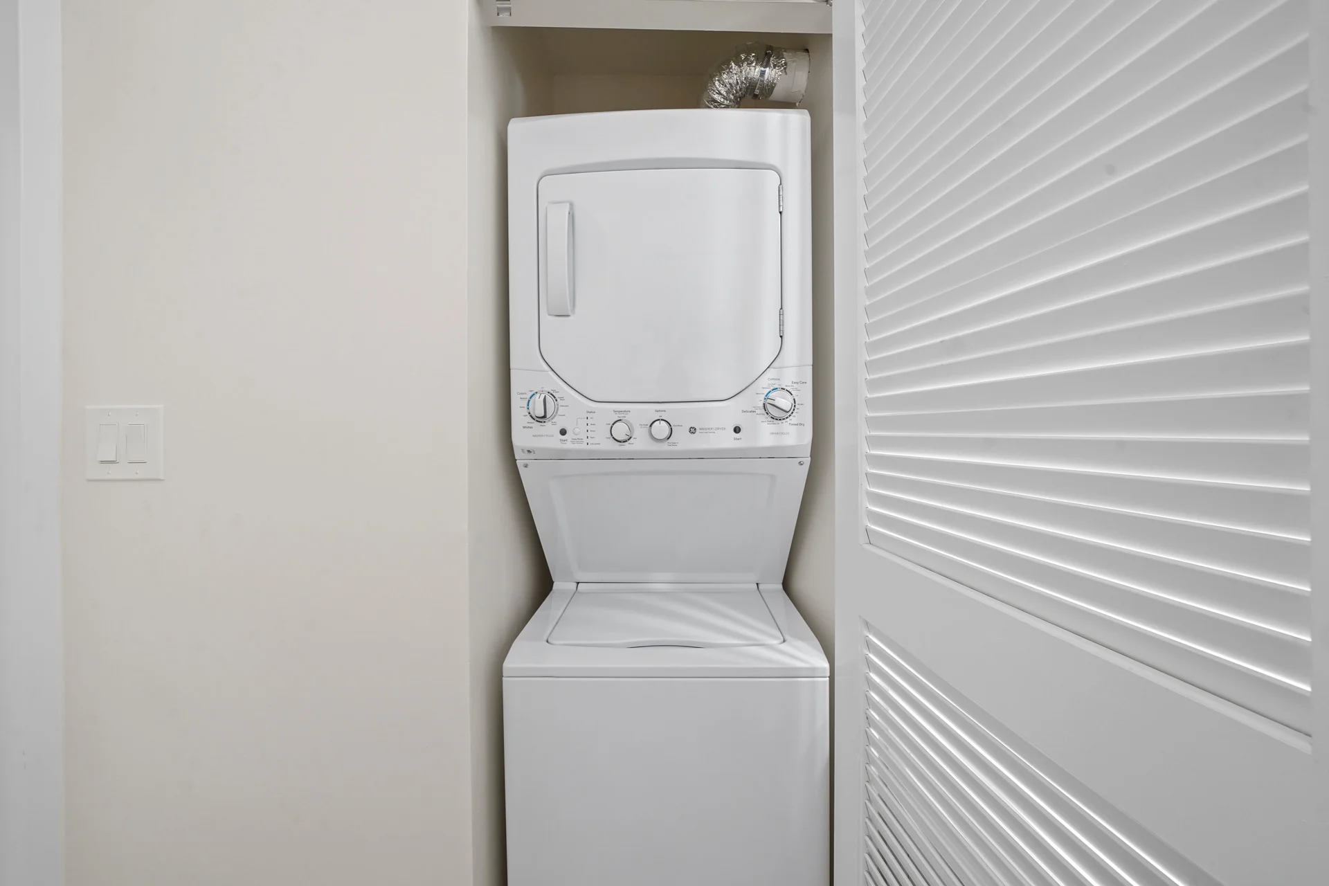 This apartment home features a comfortable living space connected to the kitchen. It also features a half bathroom with powder and laundry rooms. A private bedroom and full bathroom completes the setup.