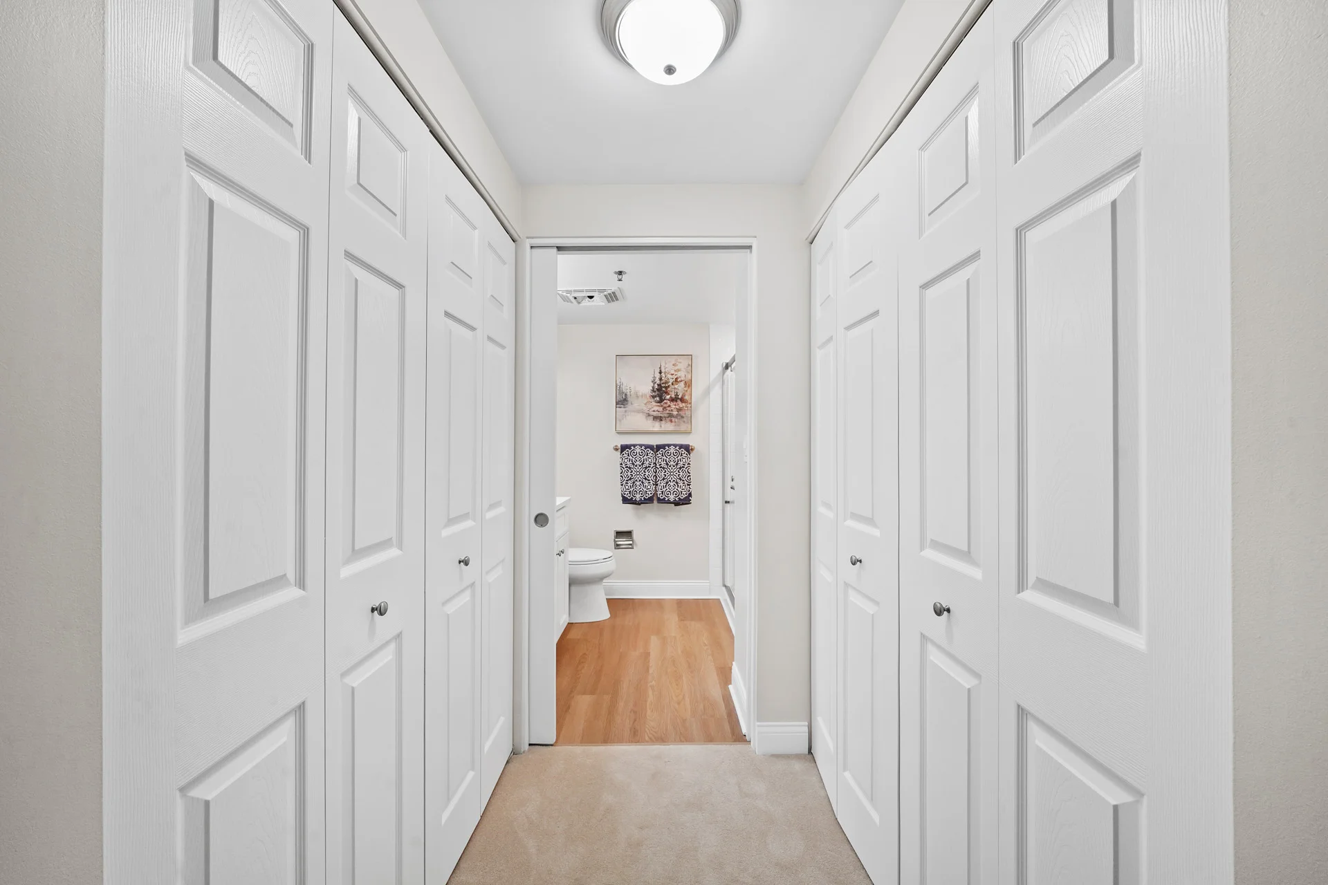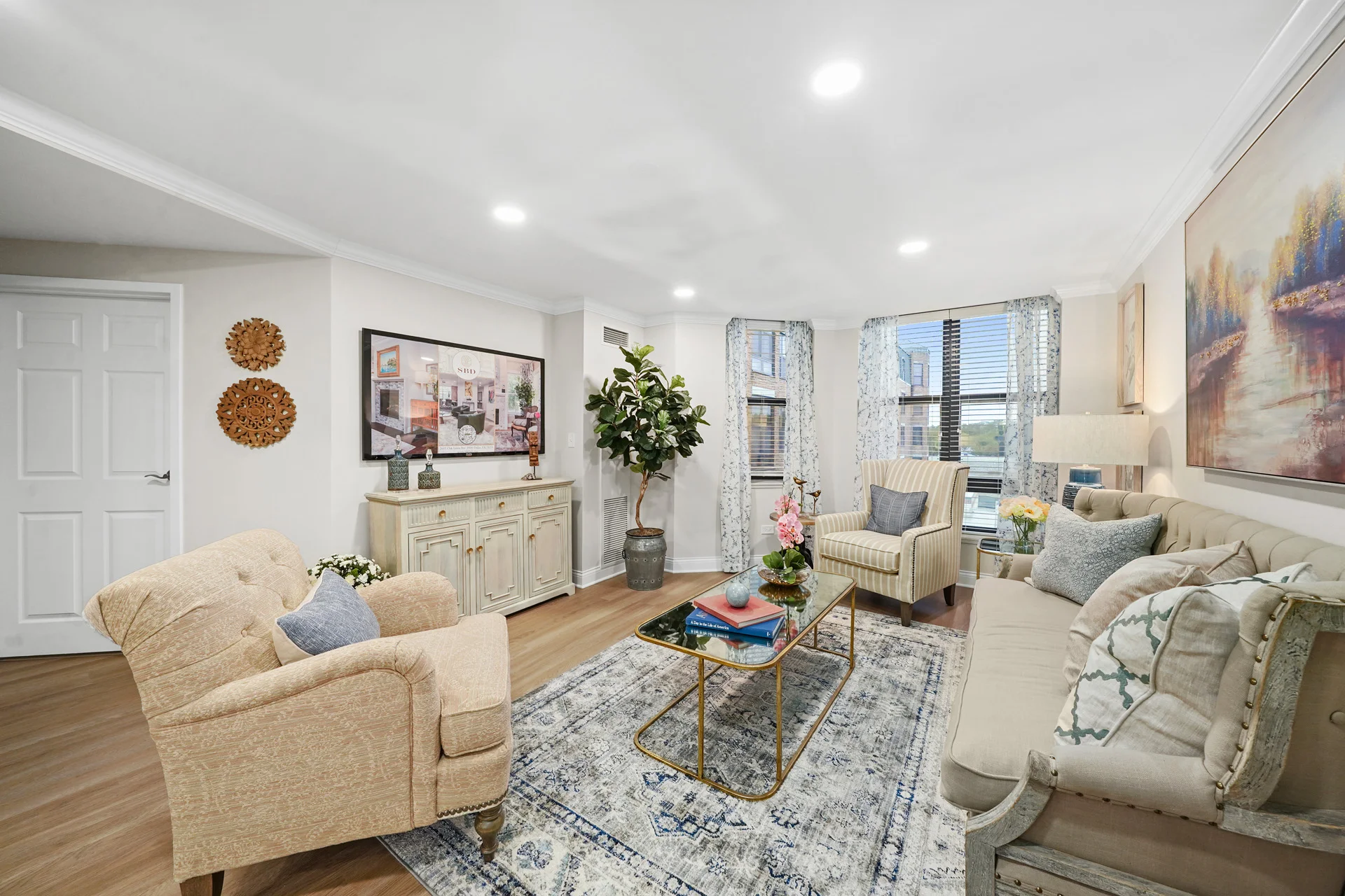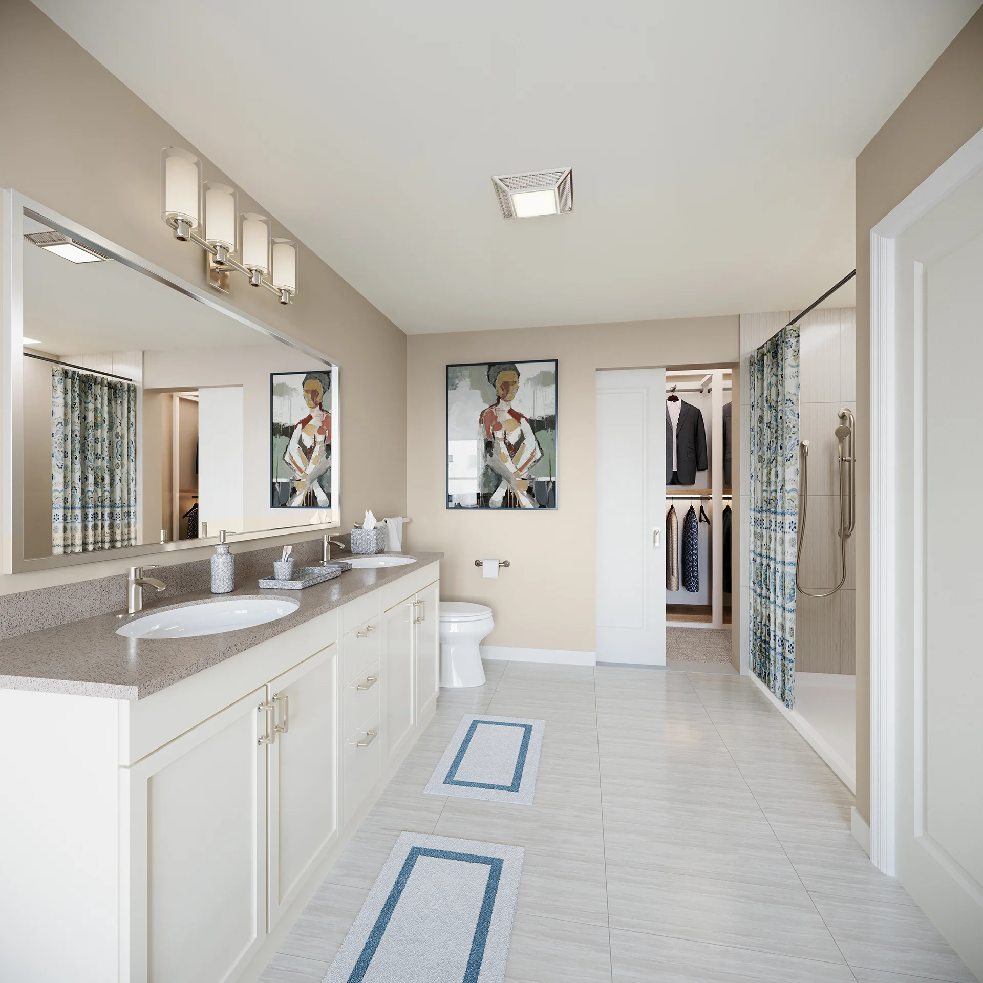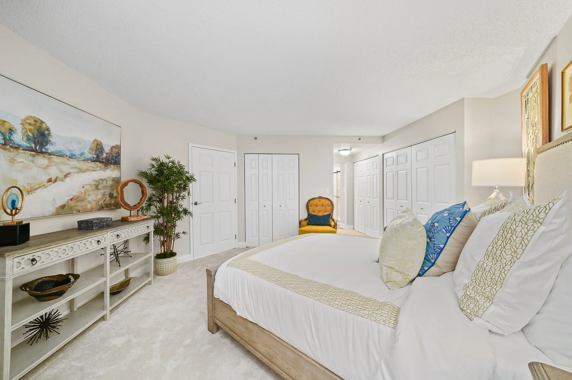 This two-bedroom residence features a generous open living area and bay window. The primary bedroom includes an en-suite bath with laundry and pass-through closets. A second bathroom accesses the hall bath.