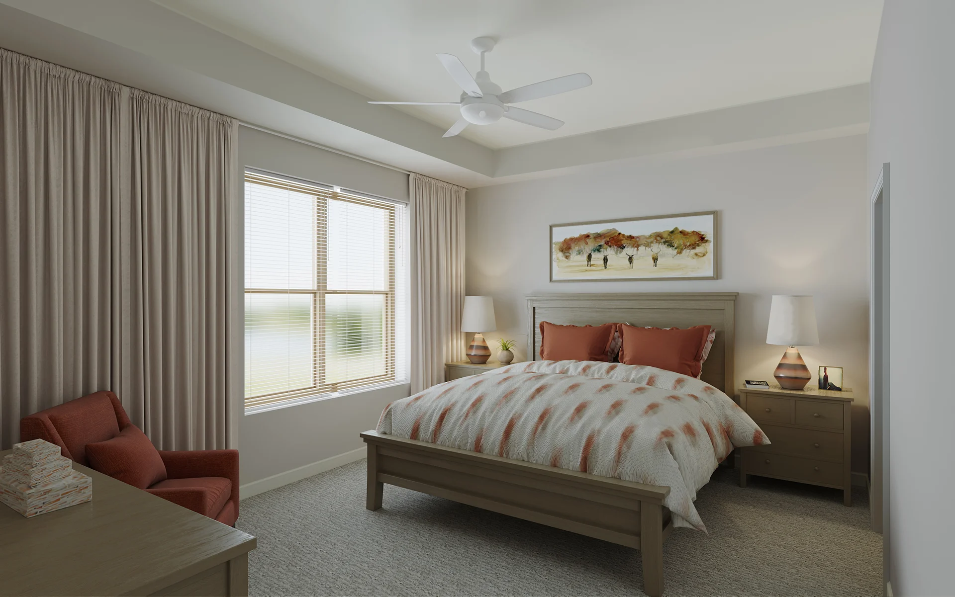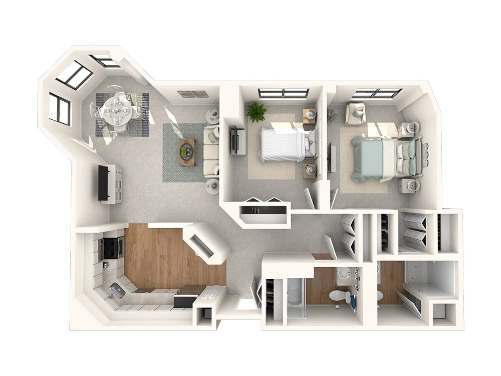 The Orchard makes the most of its 965 square feet with a layout that feels open yet private. Two separate bedroom suites offer flexibility and comfort, while the efficient kitchen and central living area bring everything together. It’s a smart choice for those who want room to relax without extra upkeep.
