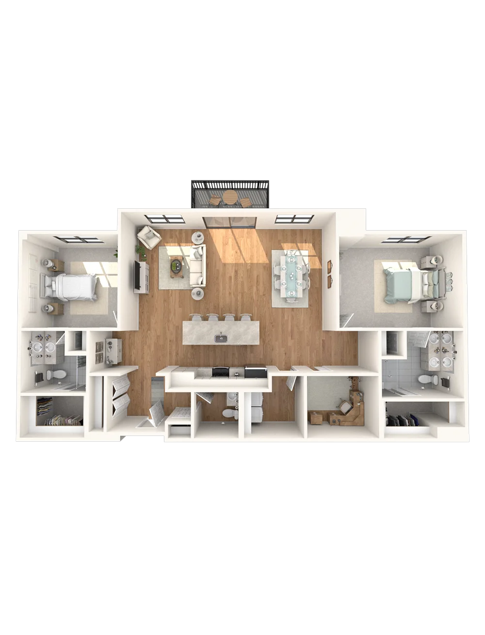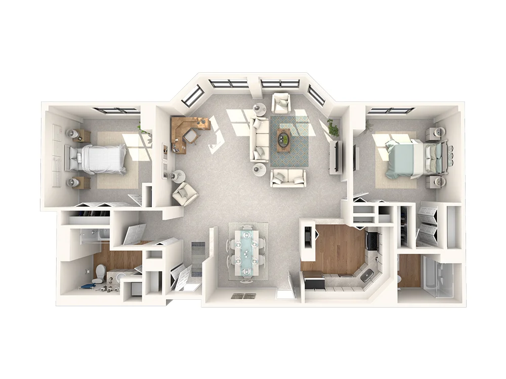 A private entryway leads you into a luxurious living area with a bay window. An open dining room sits beside the kitchen. On either side, two bedrooms and bathrooms complete the home.