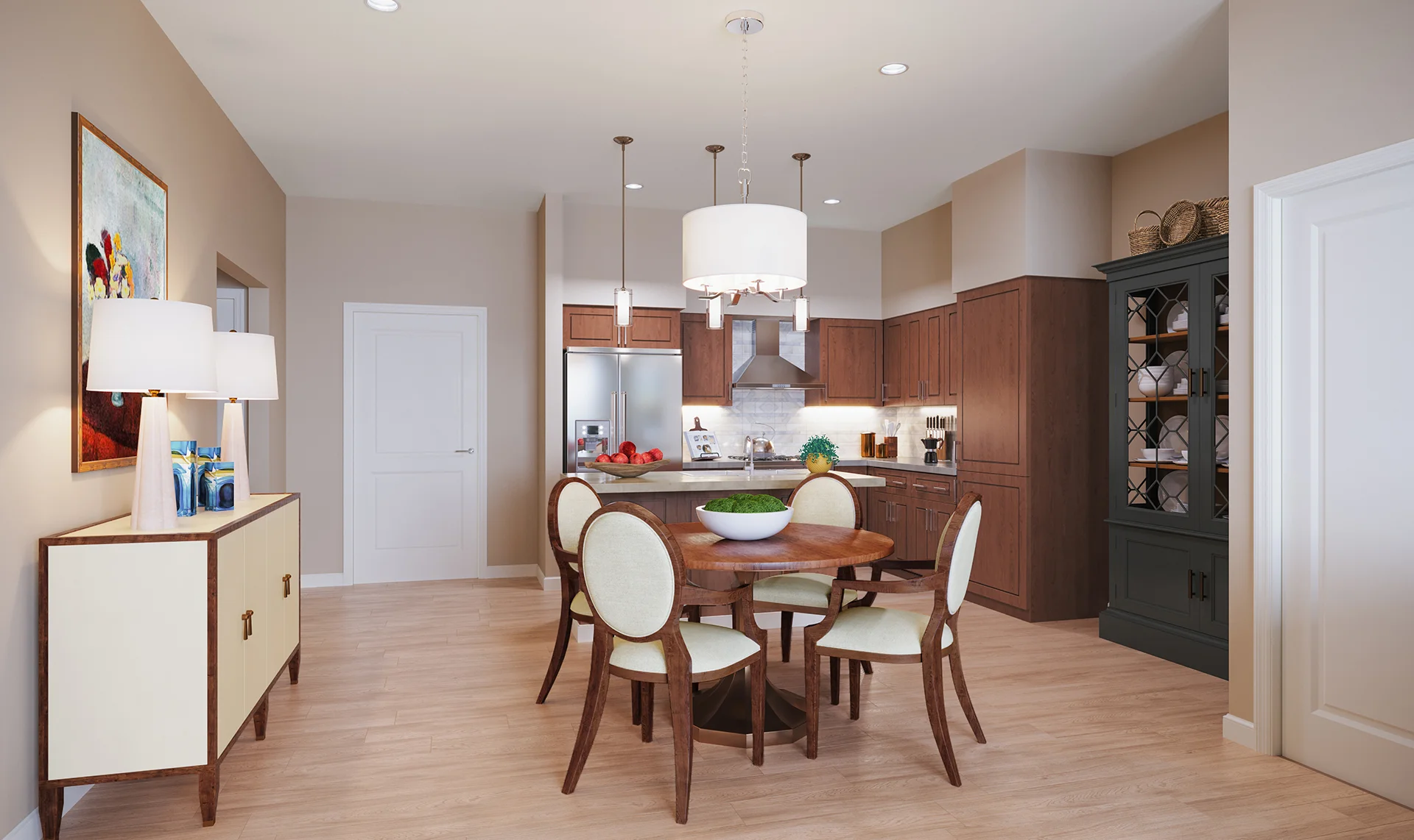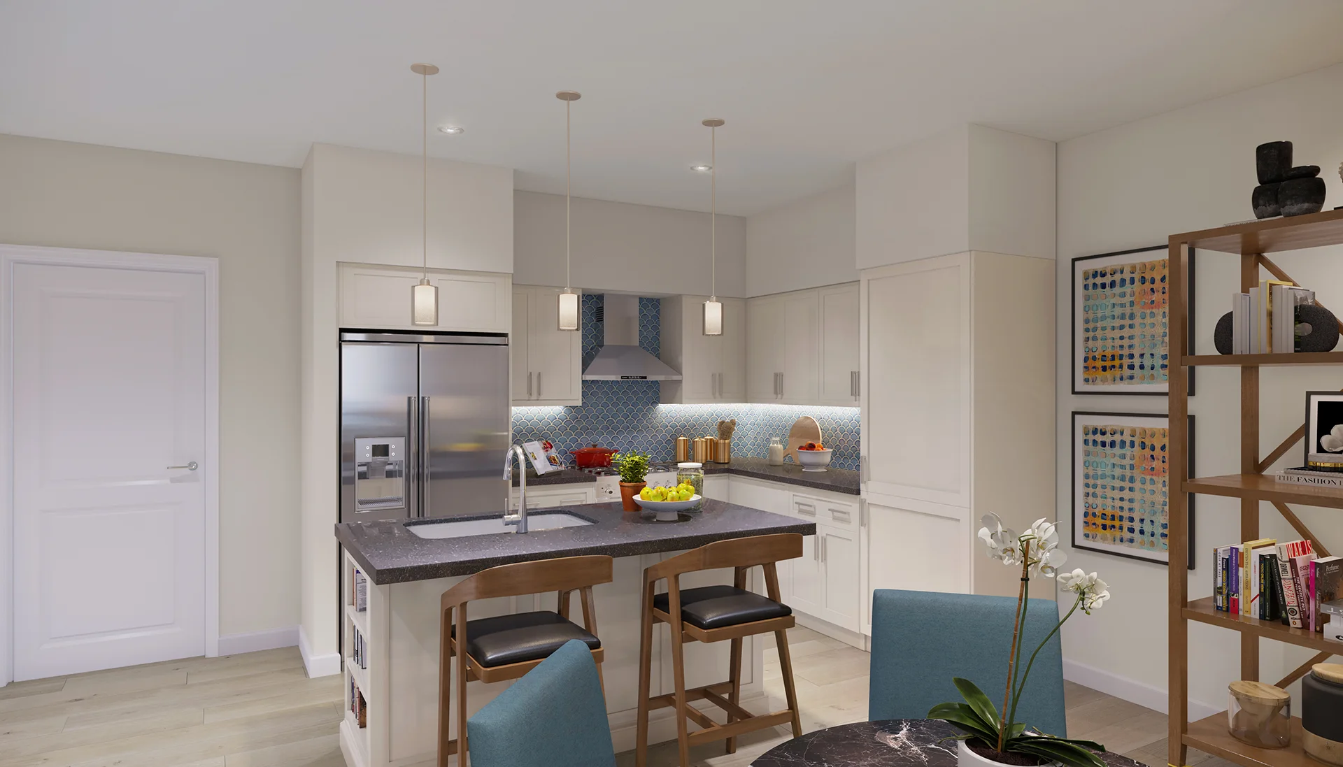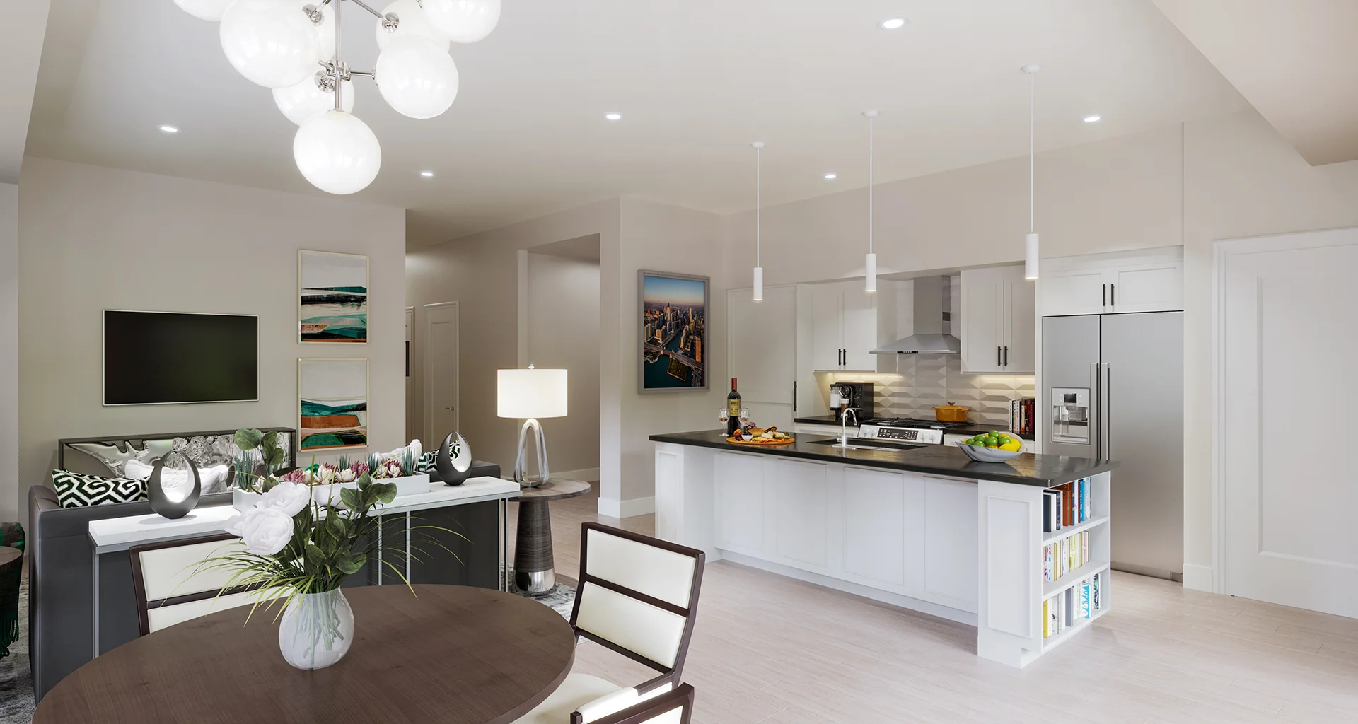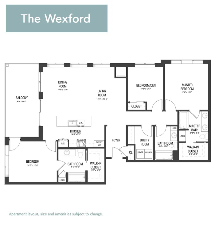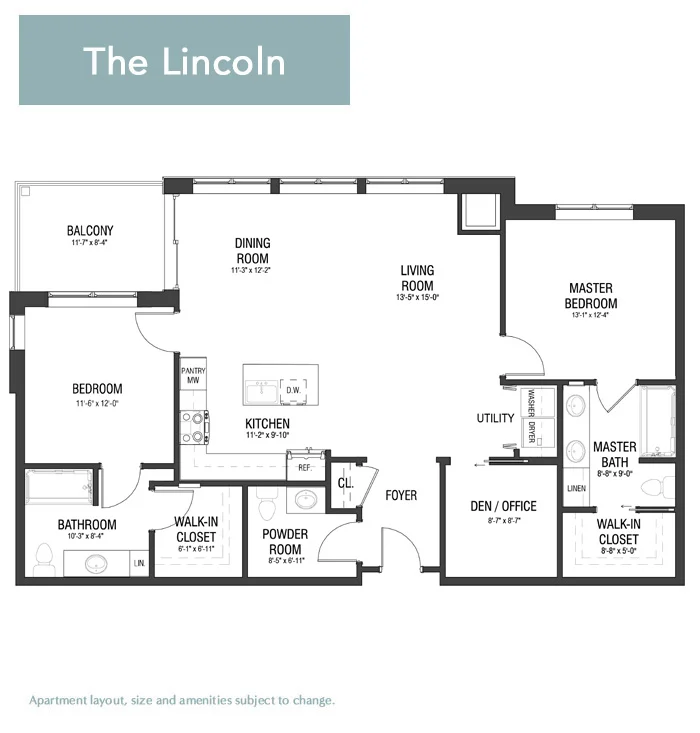 The Lincoln combines spaciousness with functionality. Covering 1,453 square feet, this layout includes two bedrooms, a large den, an open floor plan kitchen, and 2.5 bathrooms, creating an ideal environment for both relaxation and luxury. This layout also features a convenient patio off the main dining area, creating a semi-private outdoor space.