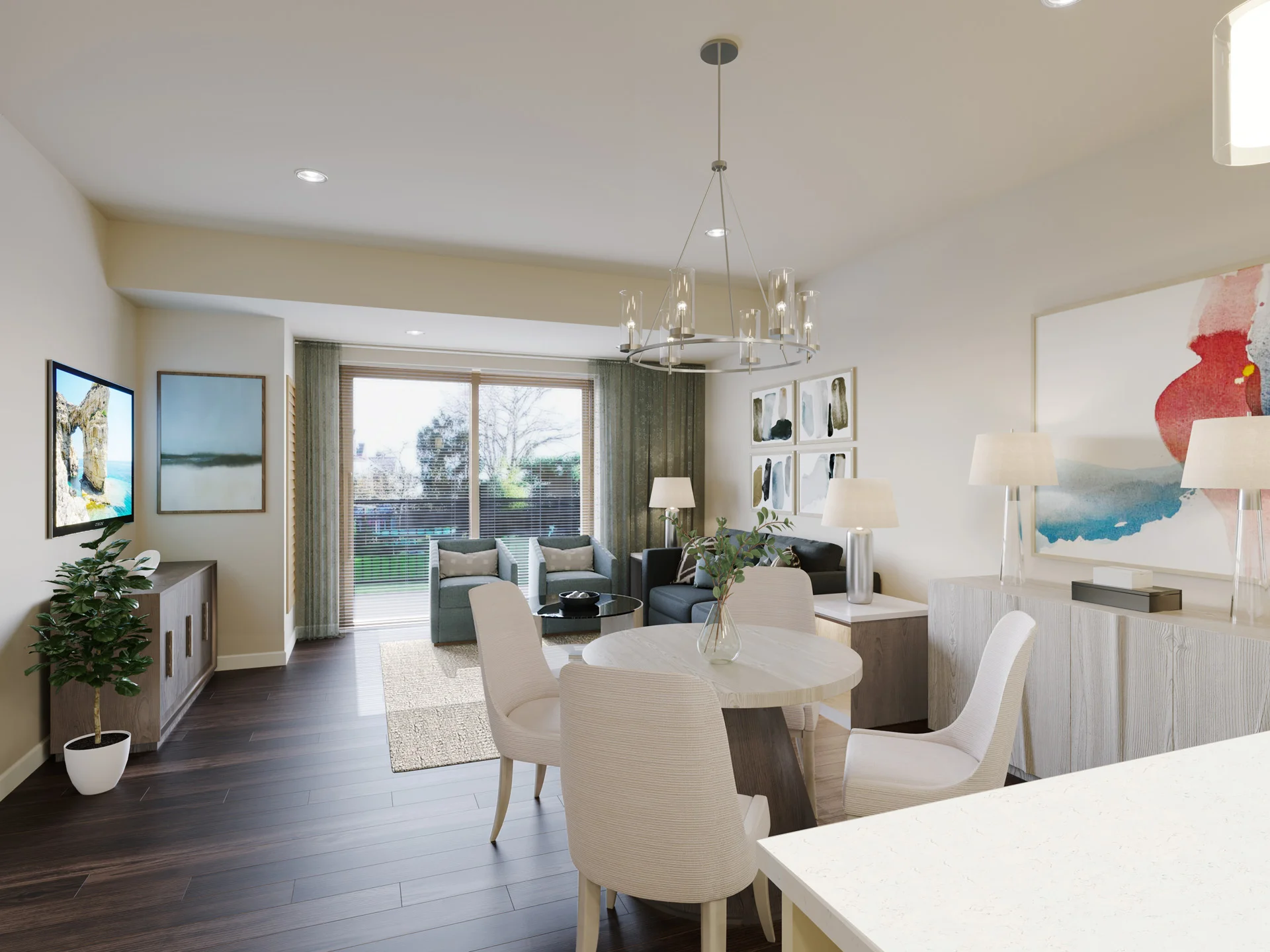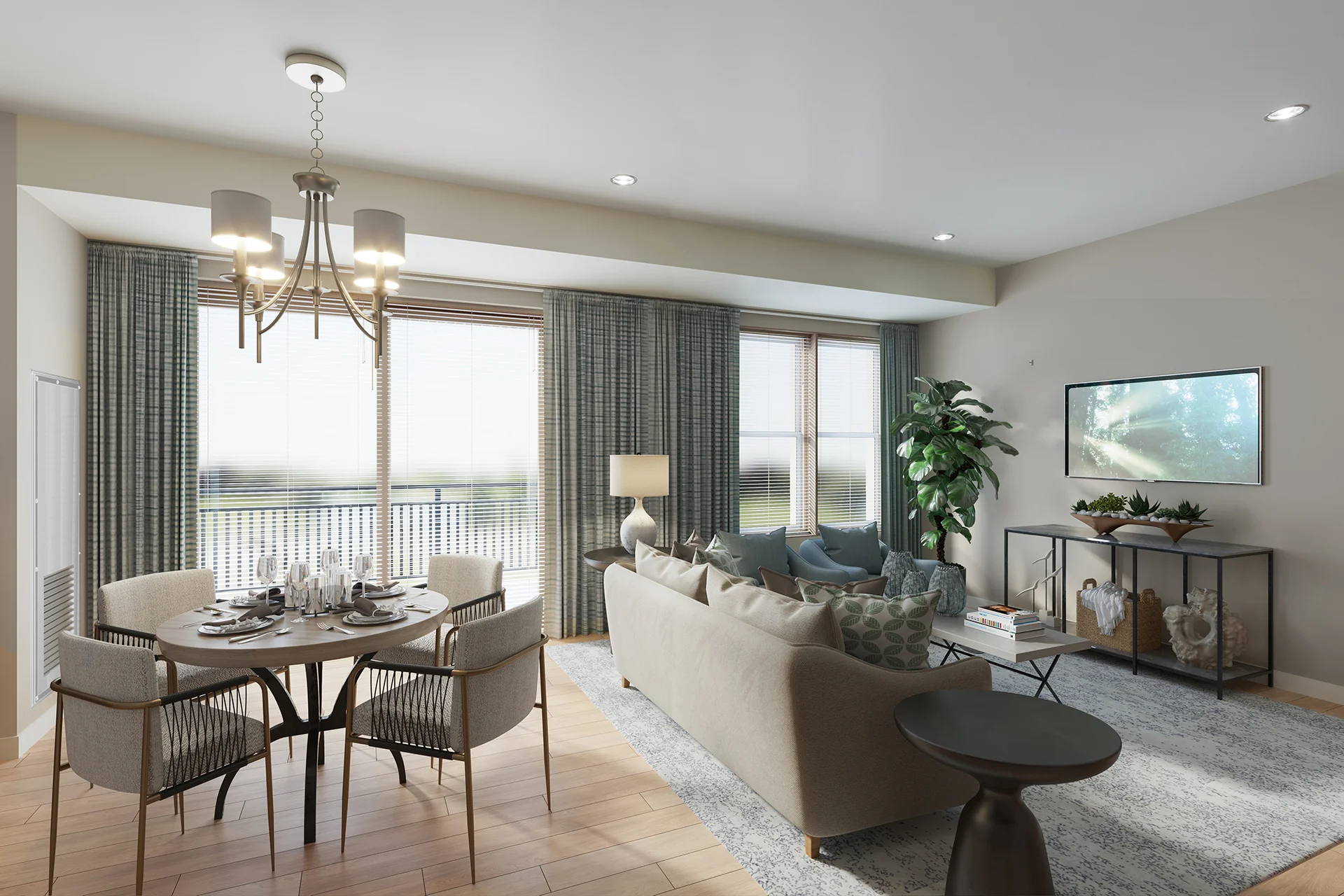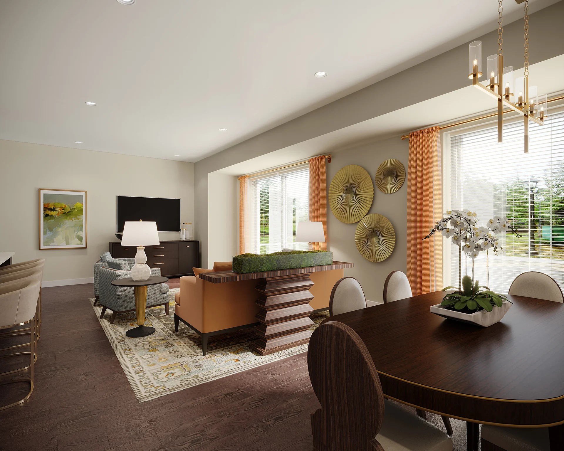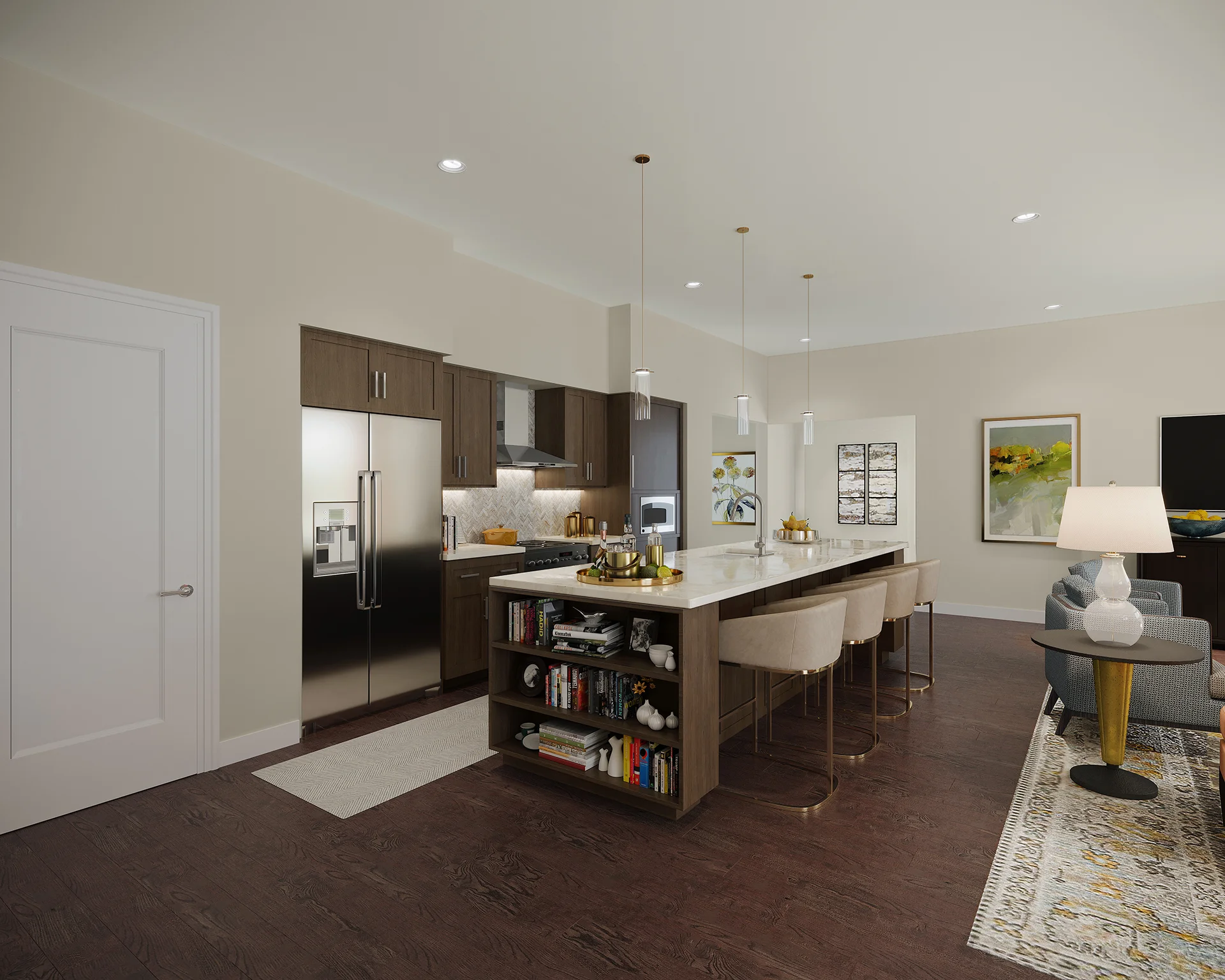 The Lincoln combines spaciousness with functionality. Covering 1,453 square feet, this layout includes two bedrooms, a large den, an open floor plan kitchen, and 2.5 bathrooms, creating an ideal environment for both relaxation and luxury. This layout also features a convenient patio off the main dining area, creating a semi-private outdoor space.