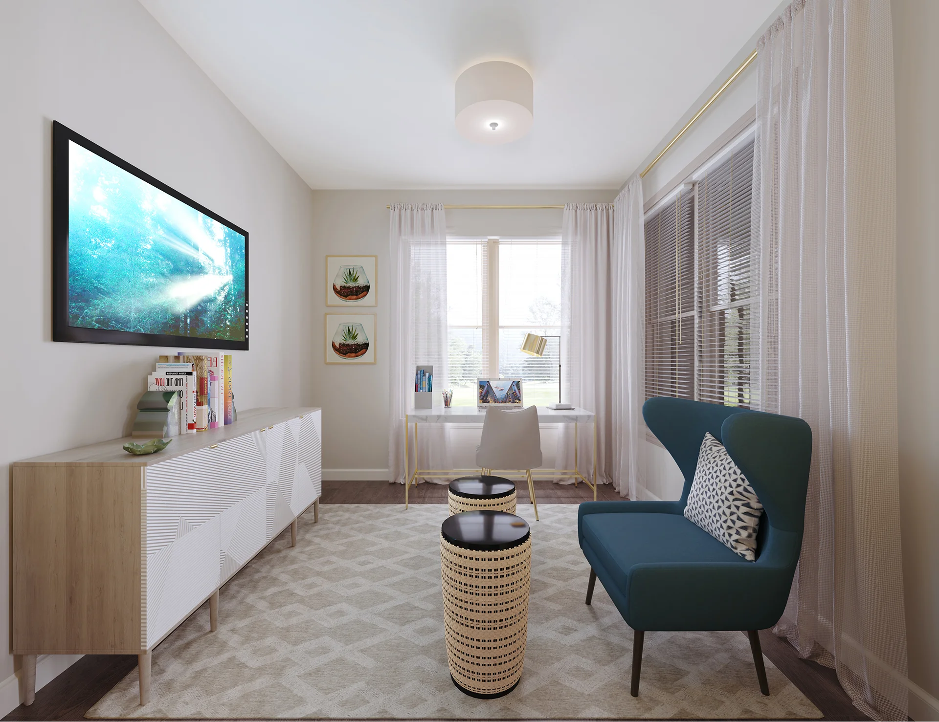 A large bay window completes the open-concept living and kitchen space of this one-bedroom apartment. The space also features a private bedroom with a walk-in closet. A full bath can be conveniently accessed through either space.