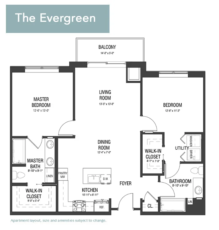 Enjoy the comfort and style of The Evergreen. This 1,186-square-foot residence boasts two spacious bedrooms, each with its own bathroom, as well as an open main living area perfect for entertaining guests. A corner kitchen offers added convenience, and this floor plan also features a walk-out patio for outdoor relaxation.