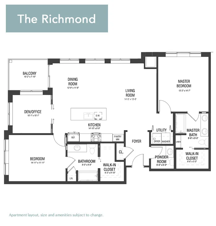 The Richmond offers an expansive 1,559-square-foot layout featuring two bedrooms, a kitchen, a den, and 2.5 bathrooms. There’s also a corner patio off the main dining area, perfect for creating your own outdoor oasis. This plan is designed for those who appreciate an extra touch of luxury and added space.